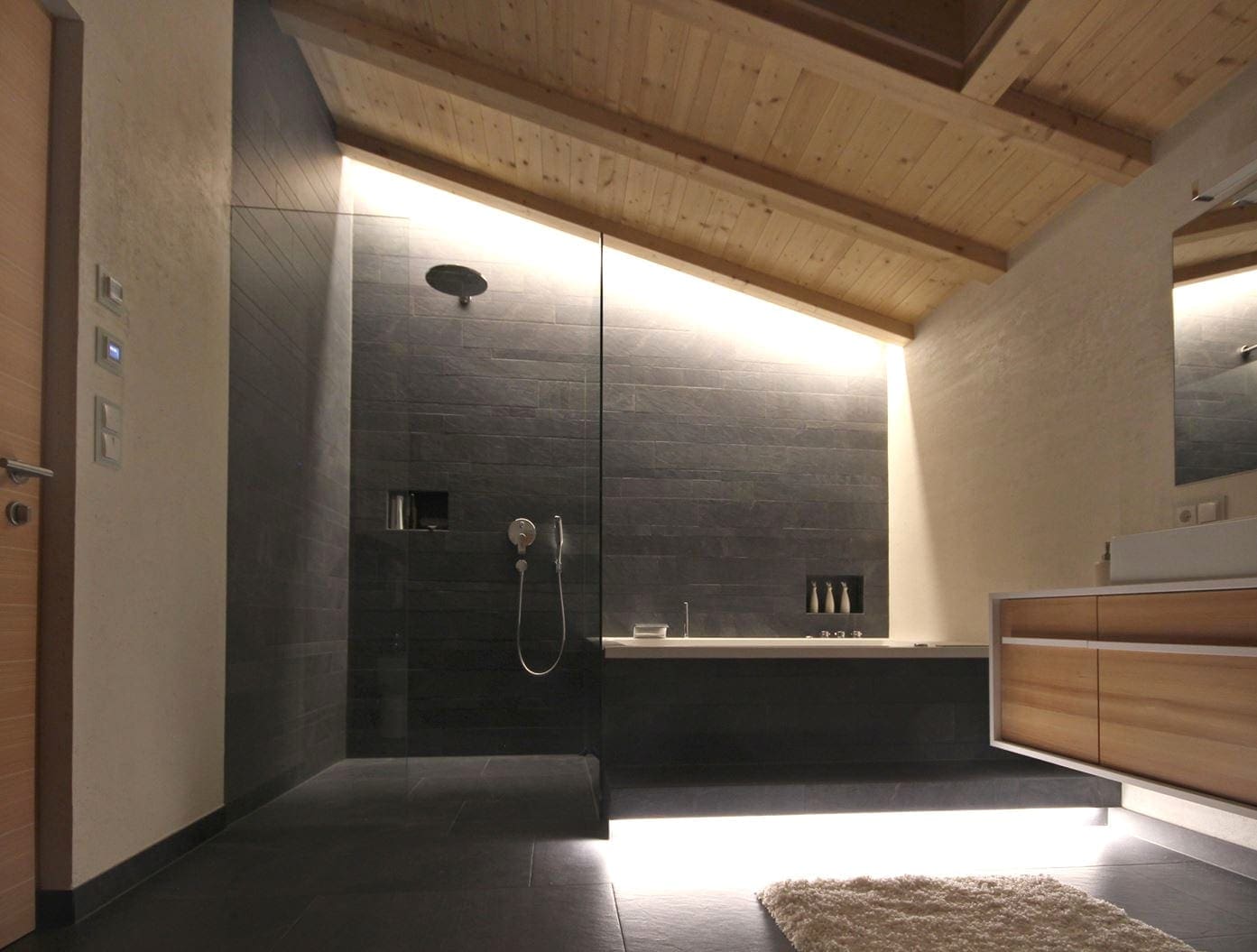 L’illuminazione a incasso posizionata dietro la doccia mette in risalto le piastrelle e fa sembrare lo spazio più grande. Anche la luce nell’angolo è interessante perché “innalza” il soffitto.