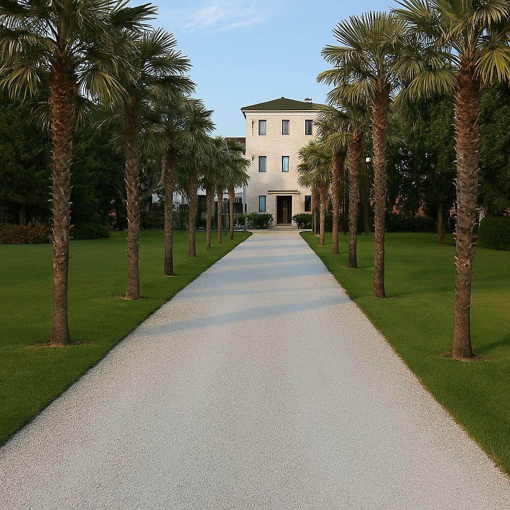 Prima di ogni scelta progettuale, è importante osservare il viale alla luce naturale: simmetrie, alberature, materiali e proporzioni sono tutti elementi che devono dialogare con la luce artificiale. Questo viale costeggiato da palme, perfettamente allineato e diretto verso un’abitazione elegante, offre un ottimo esempio di equilibrio architettonico.
