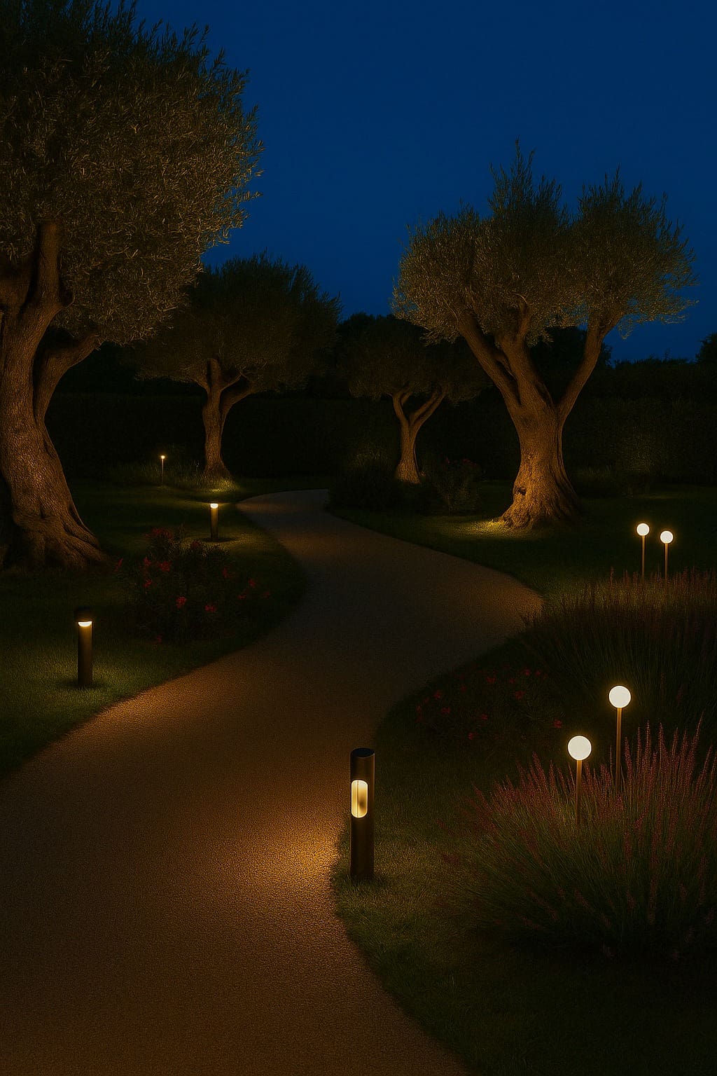 Che si tratti di un ulivo secolare, di un percorso in pietra o di una siepe di Viburnum, ogni elemento può essere valorizzato con la luce giusta, al momento giusto e nel modo più discreto.