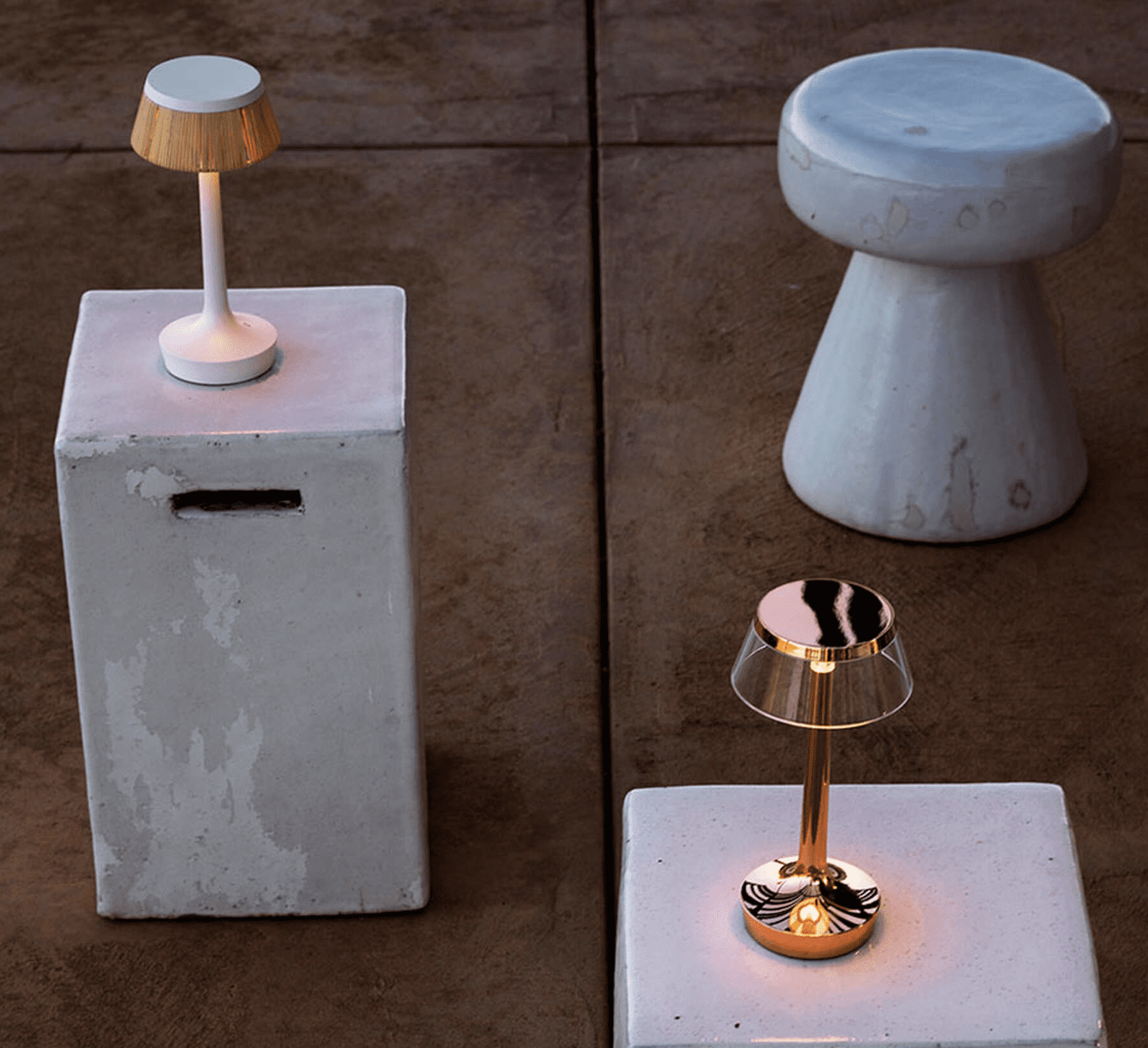 Direct light rechargeable table lamp. Base and top cover in ABS and finishing by sputtering or painting. Injection molded transparent PMMA diffuser and lampshade. Light source with Edge Lighting technology. Autonomy of 6/24 hours, recharge via Micro-USB. Slide switch positioned under the base which guarantees the 4-step dimmer function. USB-C charging cable included in the package, useful length 120 cm. USB battery charger on plug with interchangeable plugs.