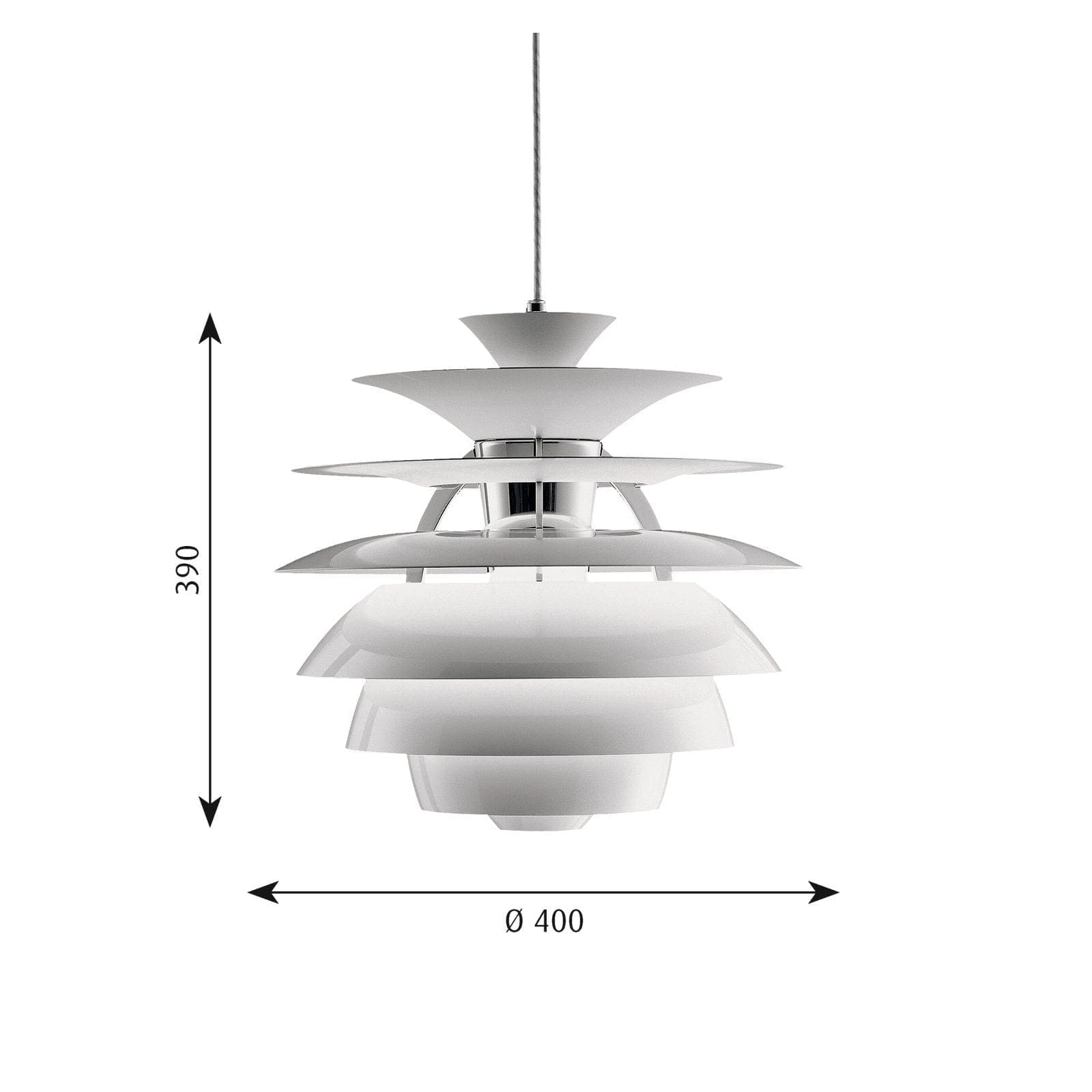 The PH Snowball chandelier is considered a smaller version of the PH Louvre, made for the Adventist Church in Skodsborg, Denmark. Unlike the PH Louvre, the number of lampshades and the diameter have been reduced because the PH Snowball is intended for places with a lower ceiling.The surface of the lampshades is in glossy white, while the inside is in opaque white.In this way the glossy white gives a brilliant effect and the opaque white prevents the light source from being reflected.
