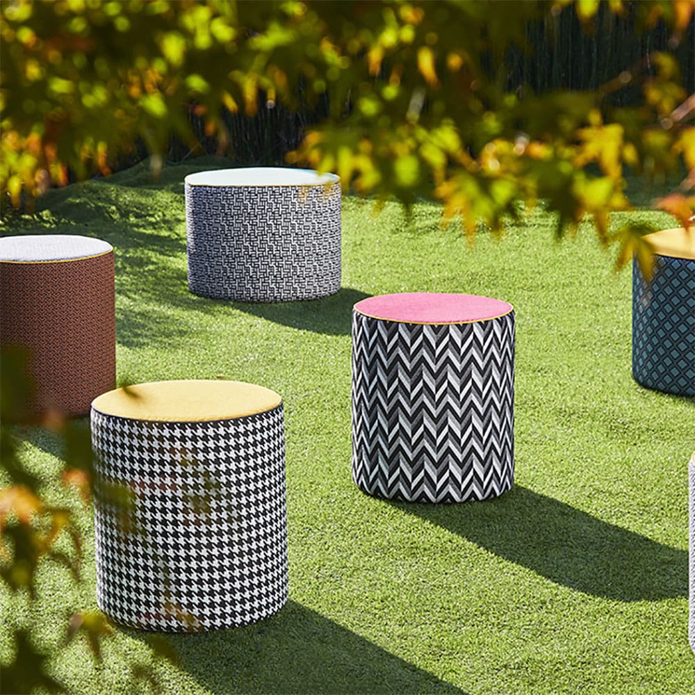 The exclusive textures of the Calypso and Babu fabrics become the unique covering of CALYBABU: the collection of outdoor poufs, designed by Massimiliano Raggi and signed Contardi, is renewed with five combinations of geometric motifs in different colours. The waterproof fabrics, water-repellent polyurethane padding and structure are suitable for outdoor use.