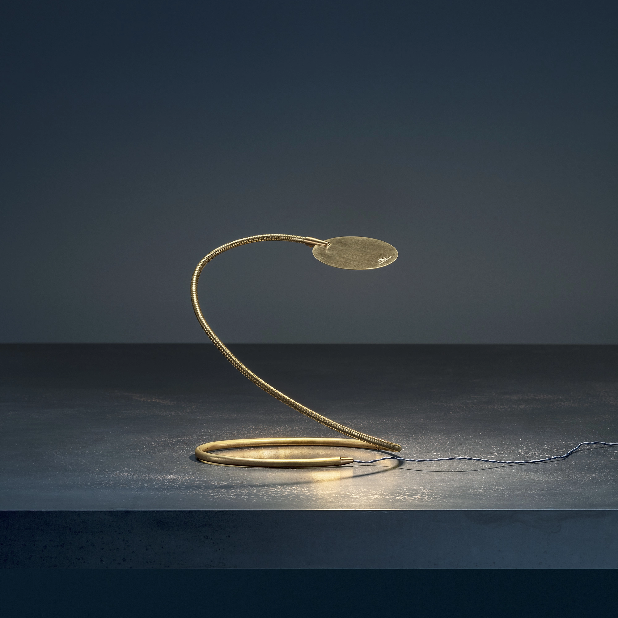 The sinuous Herem table lamp is made entirely of natural brass, characterized by a rigid base from which a mouldable flex is born, which supports a thin oval plate where a LED board with touch-less dimmer is hidden.