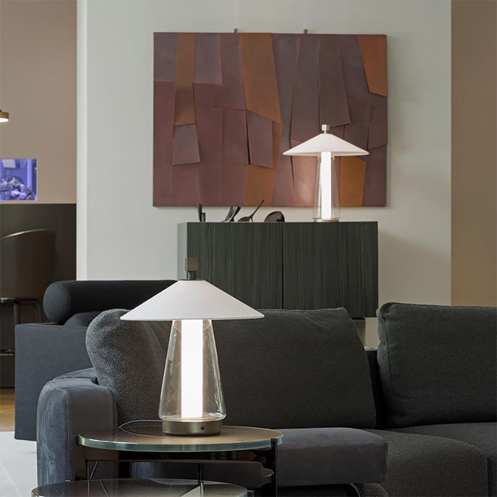 Asia, designed by Federico Peri, is an innovative concept whose light source is both the functional and decorative part of the lamp, thus perfectly embodying Contardi’s ethos of blending cutting-edge technology and creative design. A range of products characterized by a clean and linear shape, but with a strong personality, the Asia lampshade is inspired by the pointed hats of Chinese rice harvesters and the material combination of fabric, glass and metal is a further fundamental feature of the collection.
