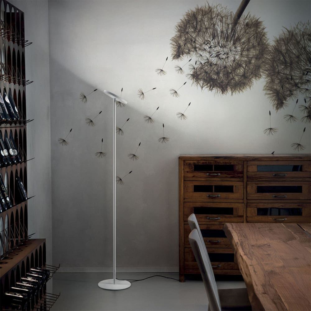 Joshua is an adjustable floor lamp with a disc diffuser providing dynamic indirect light. Metal frame and aluminum lighting body, painted white or embossed black. Polymethylmethacrylate diffuser. The tilting movement of the floor lamp allows for ever-changing gradations and lighting effects that will elegantly furnish the home. The appliance has insulation class I and can be installed on the floor.