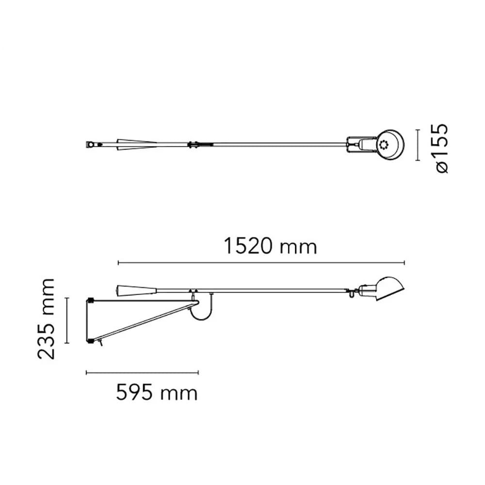Light source: LED E27 11,5W- 1100 lumens – IP20 – 220/250V. Dimensions: L. braccio 1500mm – max 570mm – Attacco 240mm.