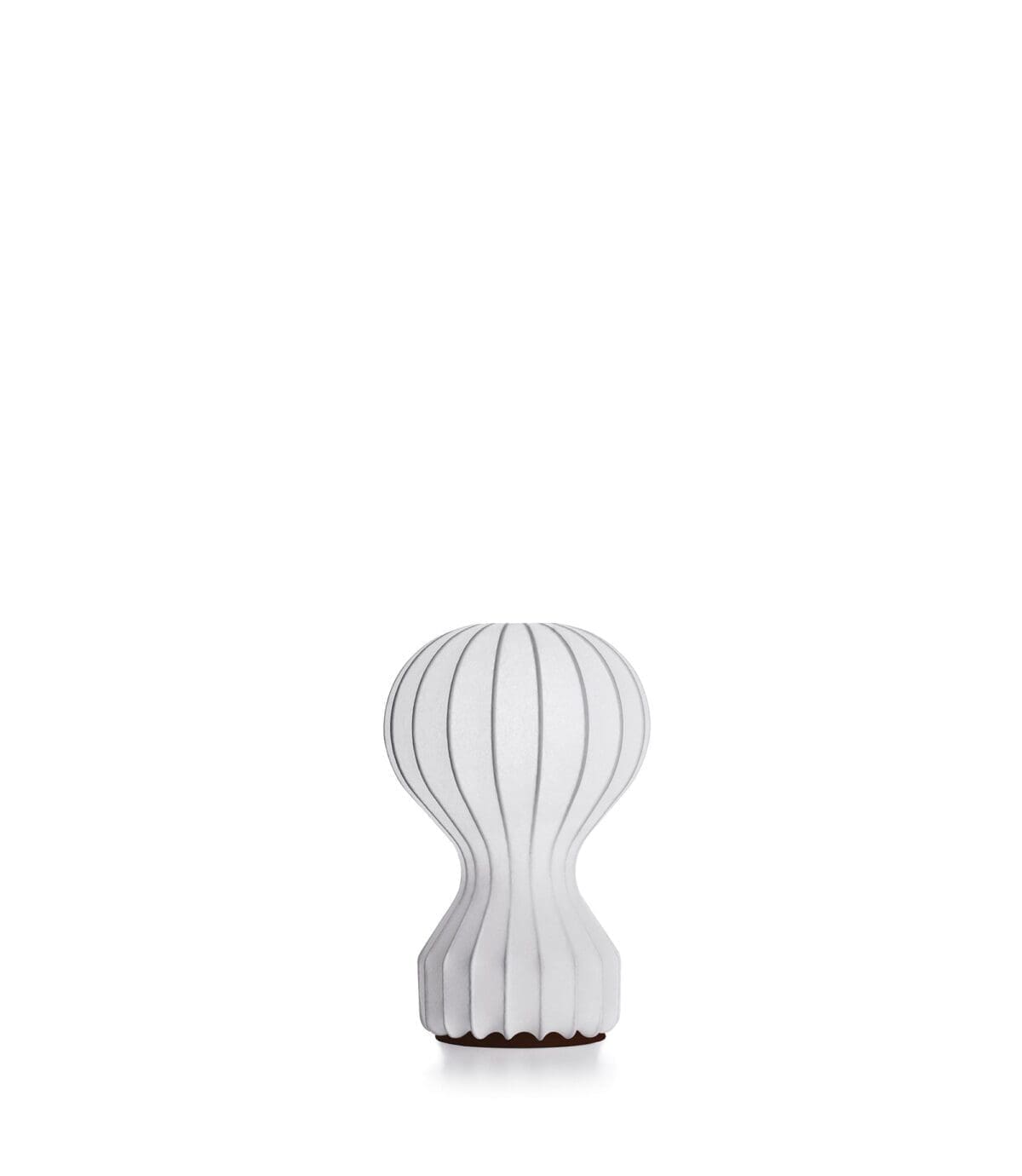 Diffused light table lamp. Internal structure in white powder coated steel. “Cocoon” resin diffuser sprayed on the structure, with transparent protection, sprayed at the end of the process. On the cable there is an electronic dimmer which allows step regulation of the light intensity.