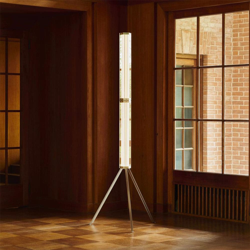 SuperWire F by Flos, designed by Formafantasma, is an innovative floor lamp that blends modern technology with artisanal craftsmanship. Inspired by 20th-century master glassmakers, this creation features a planar glass and polished aluminum structure, embodying both elegance and innovation. At its core is a thin, flexible LED strip, up to one meter long, which emits a warm, uniform glow across the entire glass surface.
