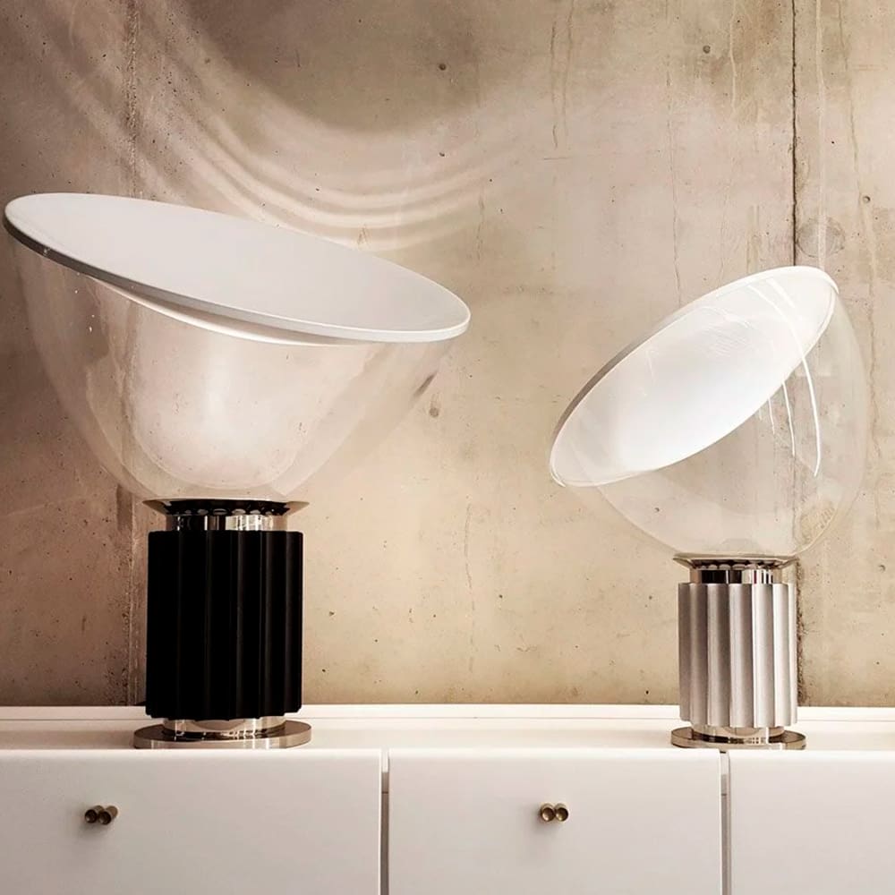 Taccia Small by Flos, designed by the famous Achille and Pier Giacomo Castiglioni in 1962, is a table lamp that offers indirect and reflected light, combining iconic design and functionality. The reflector is made of aluminum painted glossy white externally and matt white internally, ensuring uniform diffusion of light. The adjustable diffuser in mouth-blown transparent glass allows you to direct the light as needed. The body of the lamp is in extruded aluminium, available in black, matt white or natural anodized finishes, and the base is made of nickel-plated ABS+PC for greater resistance and style. Thanks to the 190 cm cable with integrated dimmer, it is possible to adjust the light intensity from 10% to 100%. Adjustable blown glass diffuser that allows you to adjust the direction of the light for personalized lighting. Painted aluminum reflector, offers indirect and reflected light, creating a welcoming atmosphere. Extruded aluminum body, available in different finishes, including black, matt white and natural anodized. Resistant base in ABS+PC: nickel-plated to ensure robustness and durability over time. Integrated dimmer, adjusts the light intensity from 10% to 100%, with ON/OFF switch positioned on the electric cable. Taccia Small by Flos is the compact version of one of the icons of Italian design, perfect for those who want effective lighting in a small space.