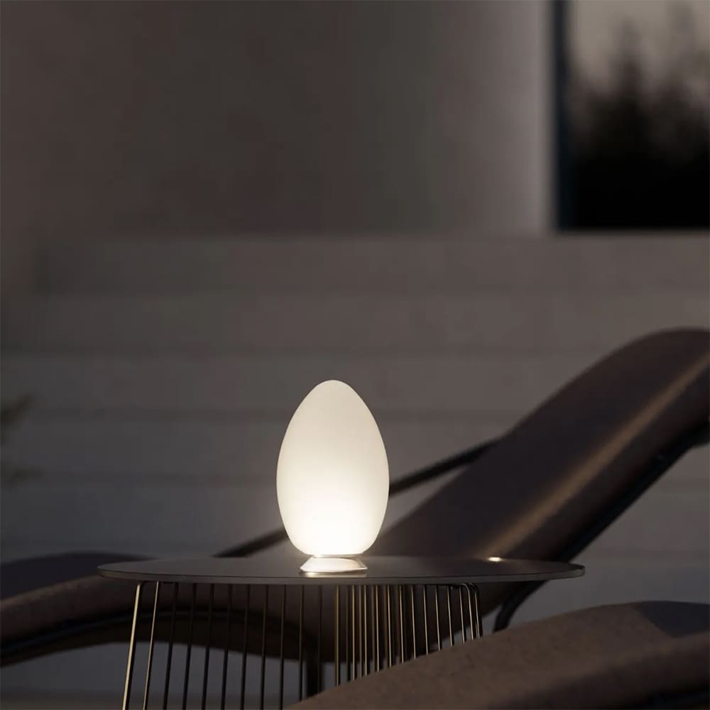 Uovo is a rechargeable table lamp, in satin blown glass, designed by BEN SWILDENS for the Fontana Arte brand. Integrated and dimmable LED light source – A transparent touch button allows you to turn the light on, off and adjust the intensity. The lamp is powered by an 8-hour battery and rechargeable via a USB cable included in the package. Plug-in power supply not included in the package. Indoor/outdoor use. A natural shape that has always been a symbol of perfection, in which symmetry and asymmetry coexist harmoniously. Designed in 1972, the shell contains a light source: an ironic idea that still conquers today. As in nature, also in the Uovo lamp the shell is an absolute example of lightness: an elegant shape in satin white blown glass, which uniformly diffuses a warm and enveloping light. In the three available sizes there is all the versatility of a collection designed for multiple uses: from a minute service lamp – in the smaller version – to a luminous sculpture, protagonist of the space, in the larger version.