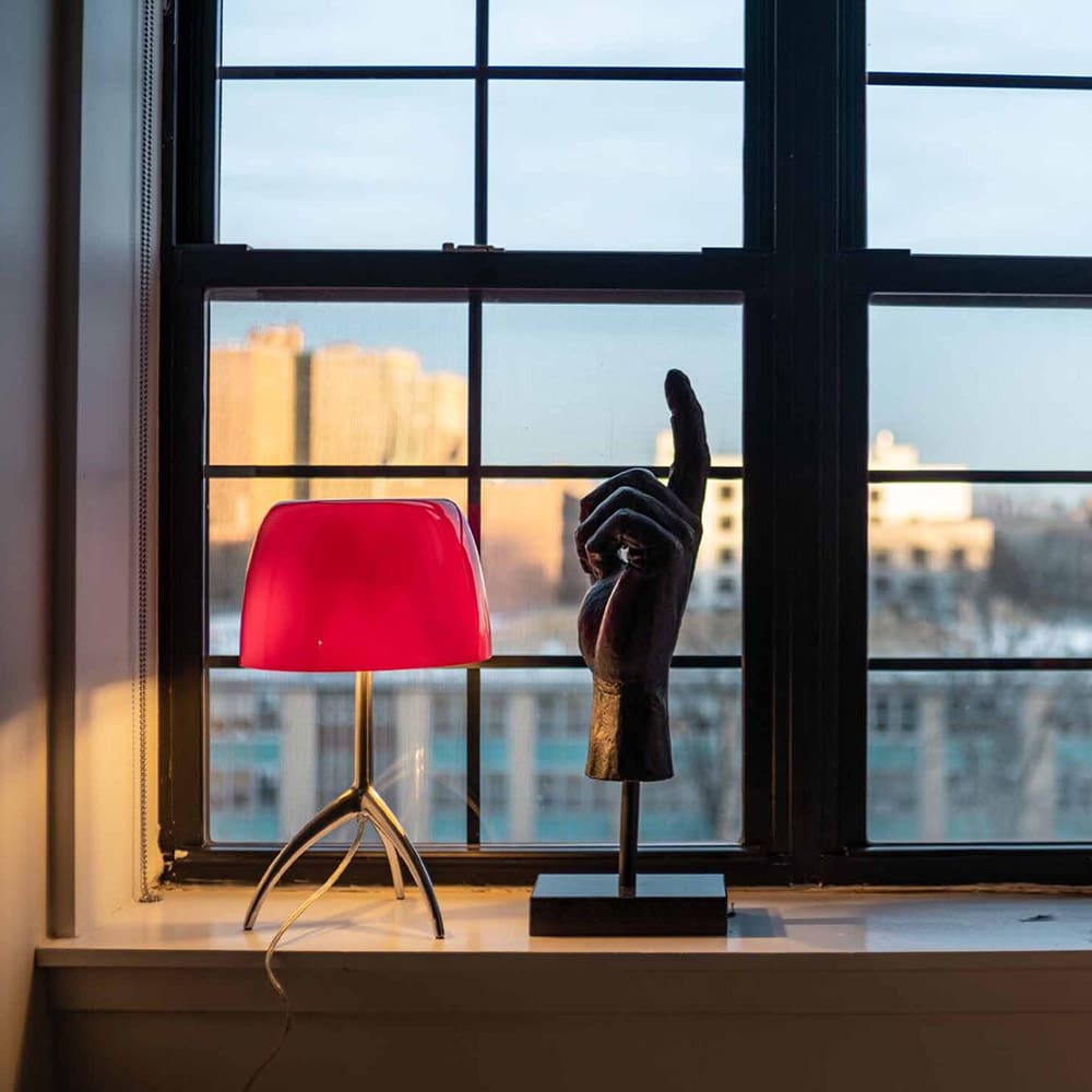 LUMIERE Table by Foscarini, designed by Rodolfo Dordoni, is a table lamp with direct and diffused light, available in two sizes. A contemporary take on the classic table lamp, Lumiere combines a refined blown glass diffuser, white on the inside and colored on the outside, with a distinctive aluminum tripod base. The cherry and warm white versions feature an additional “straw-colored” internal glass layer, enhancing the warmth and intensity of the light. The tripod base is crafted from die-cast aluminum, polished by hand in the aluminum finish, and liquid-painted for the black chrome and champagne finishes. Silicone feet ensure surface protection. Iconic and elegant, Lumiere is also available in a dimmable version for adjustable light intensity.