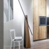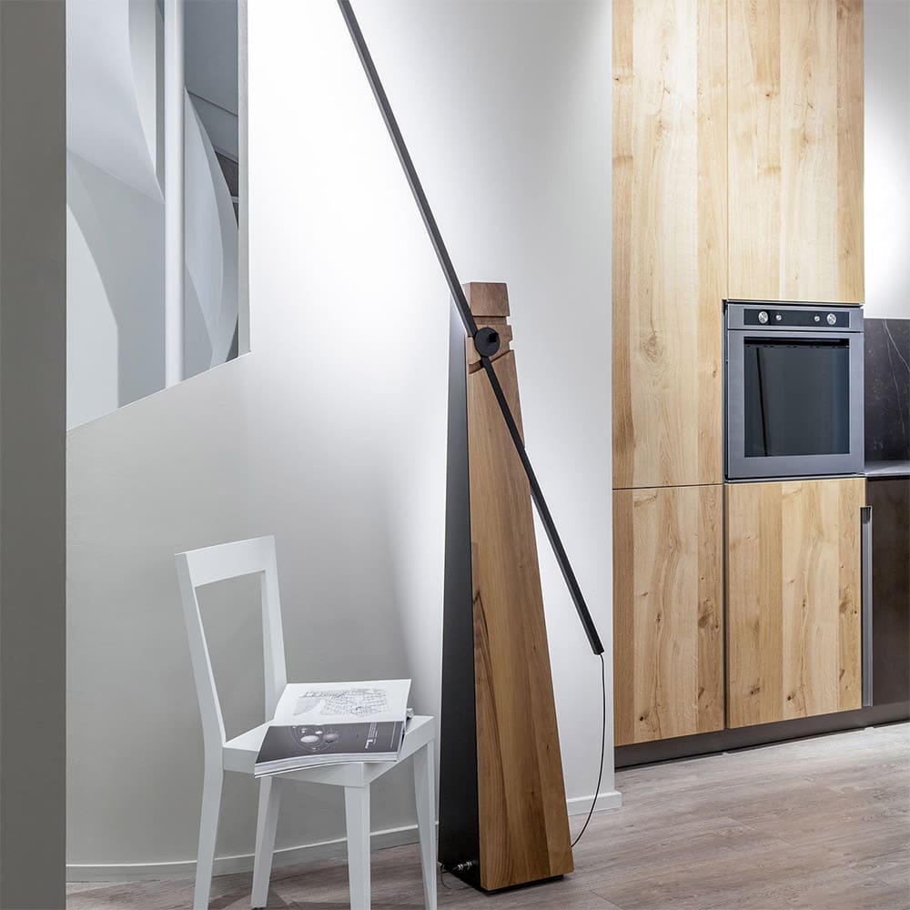 The chivalrous epic inspires the floor lamp ASTOLFO, designed by Amedeo G. Cavalchini for the Lumen Center brand, melting the ancestral and soothing structure of wood, the extreme technology of LED source and its minimal outline. Its design emulates the linear graphism of a light spear, thin and technological, mechanically inserted in a solid wood stem crossed by sharp and precise carves, where the light-spear can be placed in three different angles and orientations. The Astolfo lamp is made with a base in solid oak or national walnut and a black anodized aluminum rod.