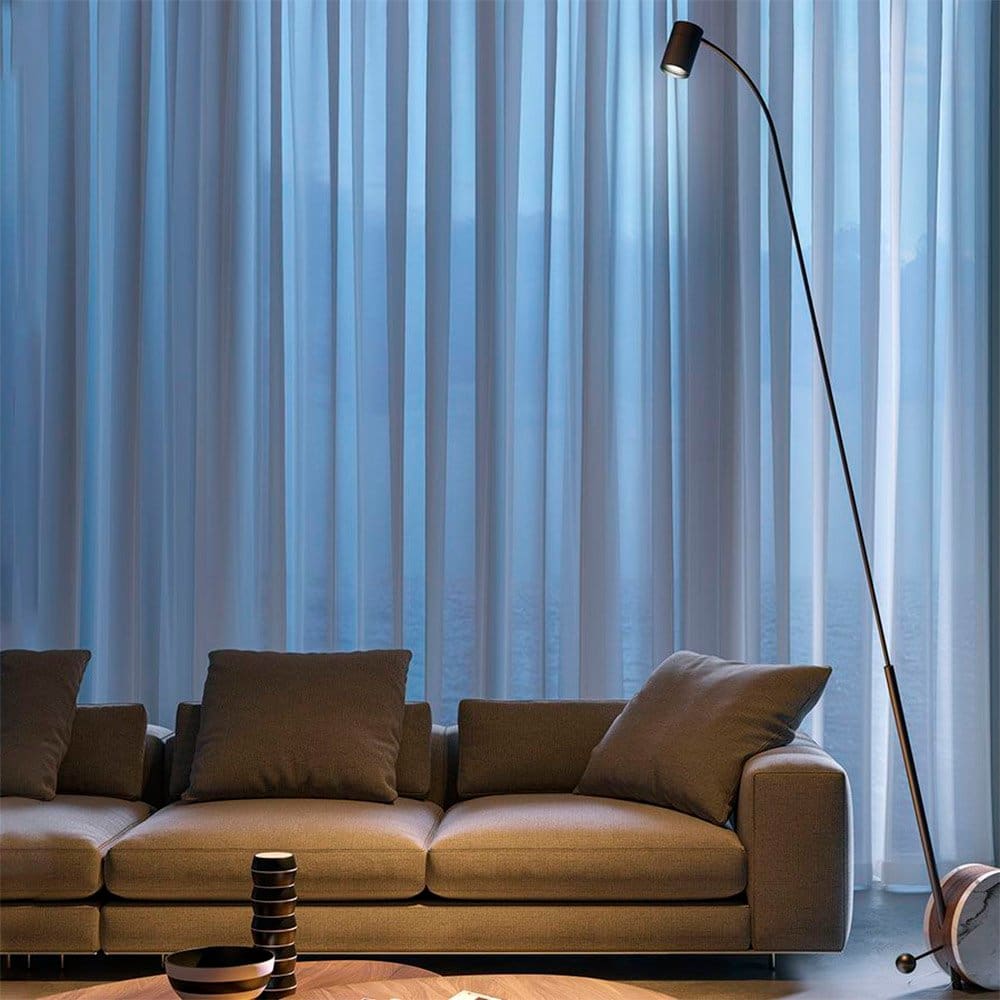 CHIOCCIOLA FLOOR, designed by AHLUX DESIGN for the Lumen Center brand, is a floor lighting fixture with a telescopic rod that allows it to be used in different contexts, where mobile and high-performance light is needed. The main structure is available in black or matte white. Circular base in white Carrara marble and Canaletto walnut wood. The Chiocciola family presents itself as a collection of silent objects, where the protagonist is light, direct and adjustable.