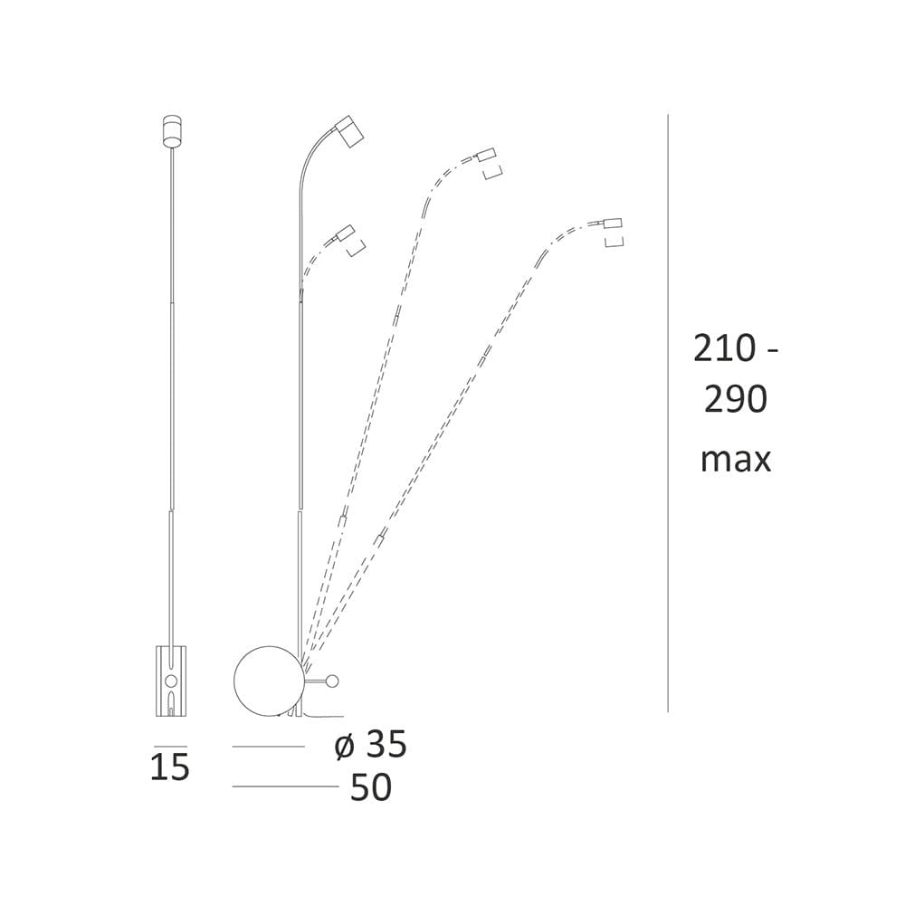 Light source: LED (included) – 30W – 2700K – 220-240V – 2900 lumens – CRI>97 – Foot Dimmer included . Dimensions: L 50 cm H max. 210 – 290 cm Ø 35 cm