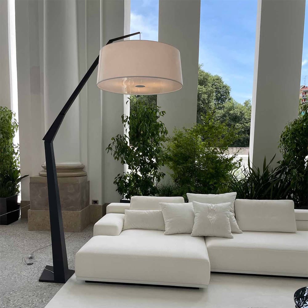 GRUS is a floor lamp designed by Alberto Saggia and Valerio Sommella for the Lumen Center brand, with a decentralized light point characterized by a slender geometric structure made of painted sheet metal. Grus takes inspiration from the elegant and long-limbed bird – which also gives its name to the small constellation – whose characteristic pose it recalls about to take flight. The painted sheet metal is available in the elegant graphite gray finish while the large fabric diffuser is available in the white, wine red and sage finishes.