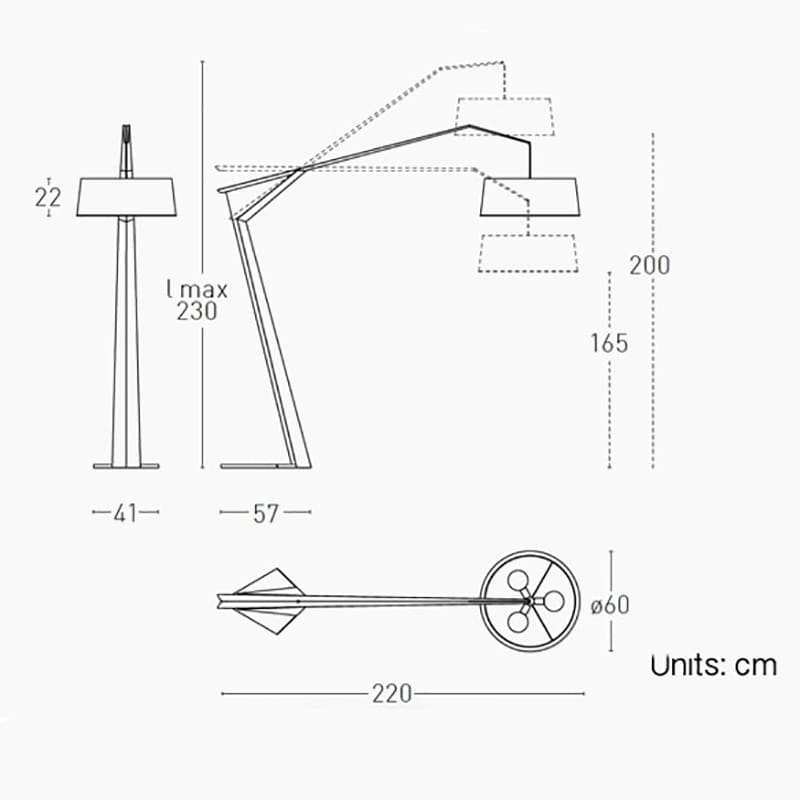 Light source: N.3xLED E27-E26 (not included) – n.3 min.5w – 220/240V.E27-110/120.E26 – IP20 – dimmer on cable included . Dimensions: L 220 cm base: 57 cm W 16 cm base: 41 cm Ø Paralume: 60 cm H 200 cm