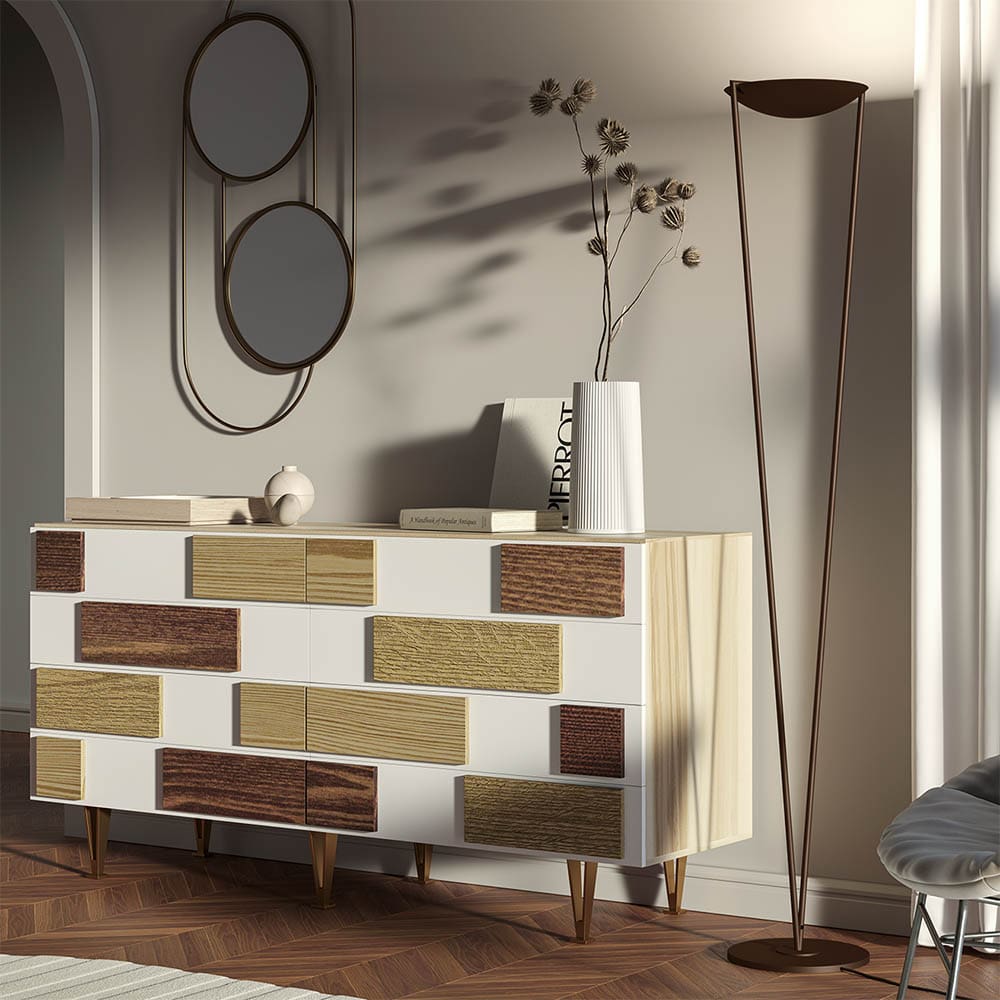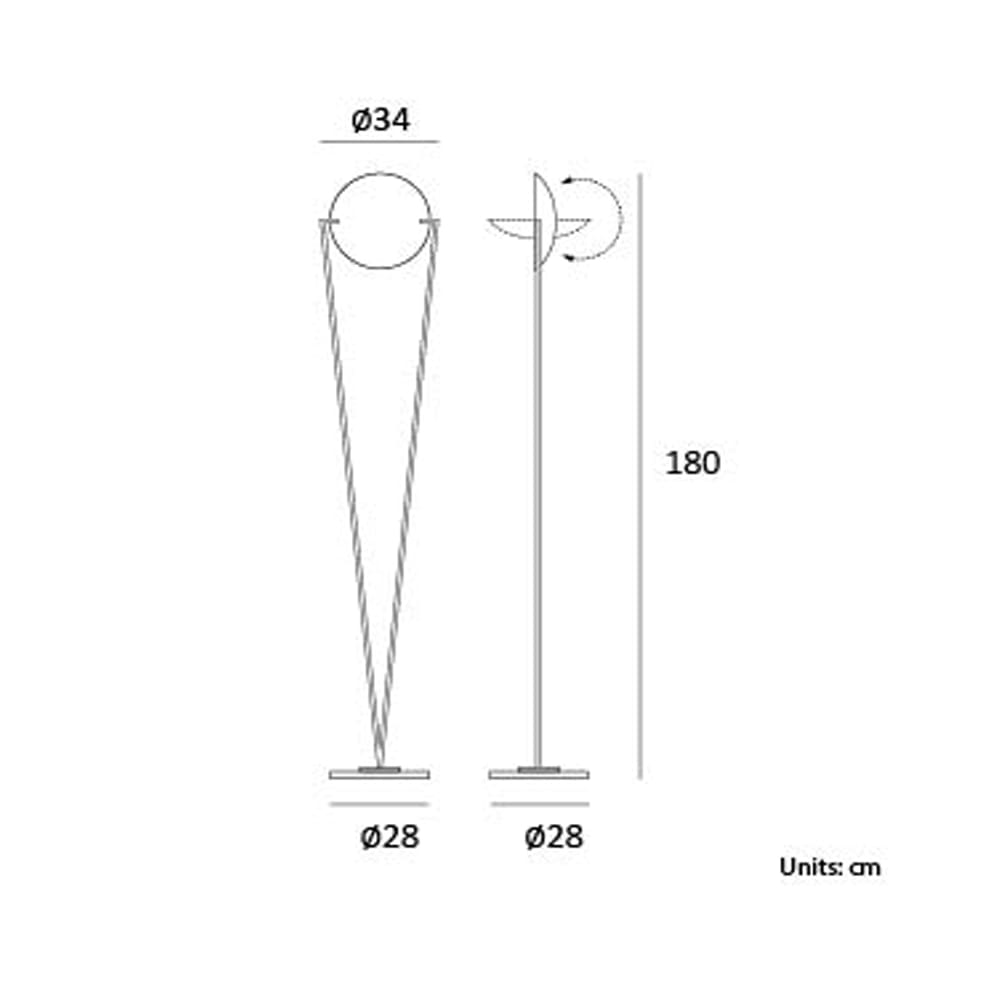 Light source: LED COB – 40W – 3000K – 3900 lumens – CRI>90 – Electronic driver: Included – Foot dimmer – IP 20. Dimensions: Ø 34 cm H 180 cm