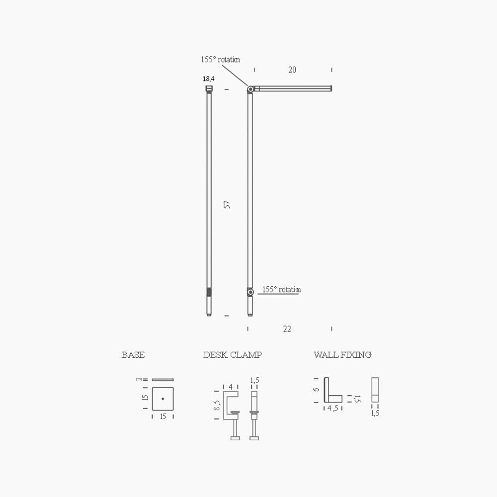 Light source: LED 7W – 3000K – 485 lumens – CRI=90 – 110-240V – Dimmable on board – IP20. Dimensions: L 20 cm H 57 cm