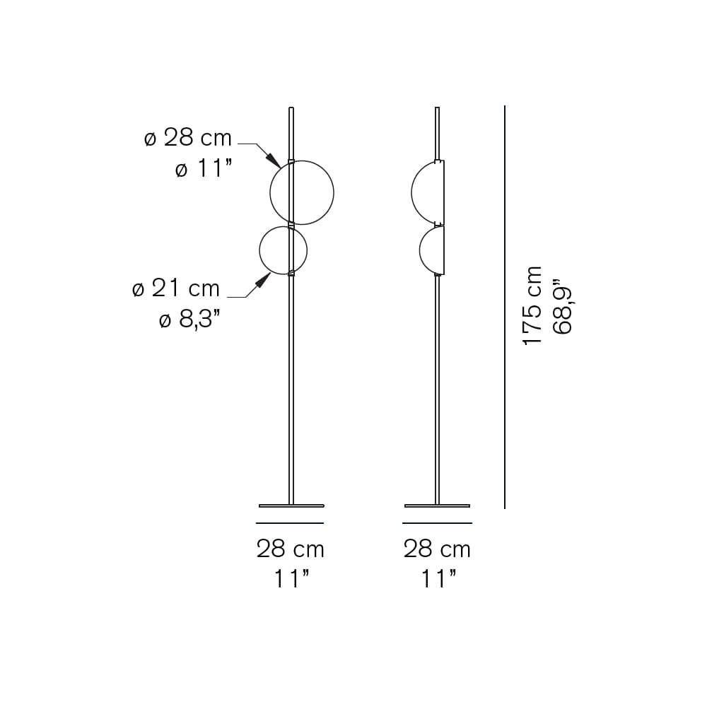 Light source: LED 1 x max 5,5W (bulb included) + LED 1 x max 6,5W (bulb included) – 3000 K – 1150 lumens – CRI>85. Dimensions: L 28 cm H 175 cm