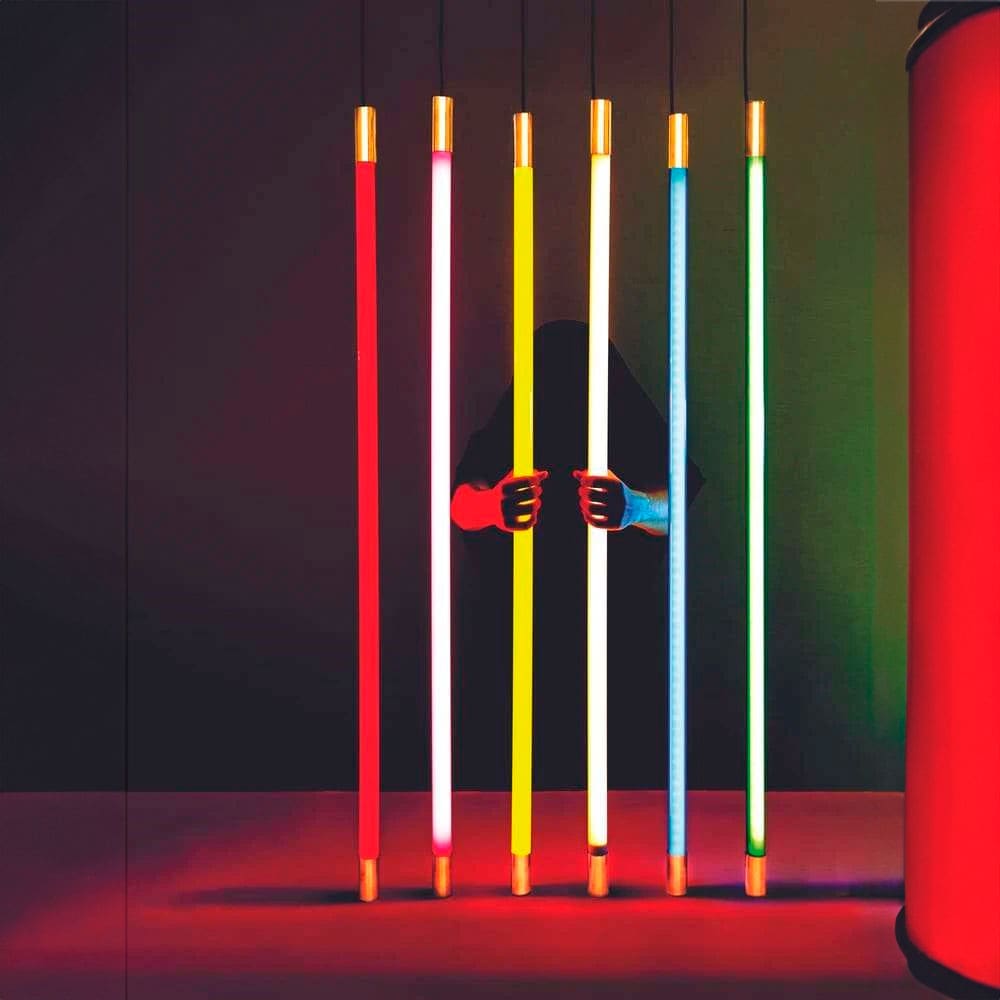Line Golden End is a fluorescent LED lamp with plastic structure for indoor use, designed by Selab for the Seletti brand. Available in different colors. Seletti is a magic box where Figurative design and Pop Art meet. Seletti, a story of vision and evolution. Since its foundation in 1964, the company has pursued its mission of enhancing professionalism, service and above all continuous product research, aiming for improvement, innovation and originality.
