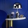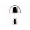 Bell is a dome suspended on a dome formed from stamped and plated steel. The lamps are the result of a high workmanship that leaves no joints to appear and generates a minimalist design. Bell is an exercise in reductionism and its glossy surface reflects the features and colors of its surroundings. The table lamps feature a smooth built-in dimmer and have a weighted base for added stability.