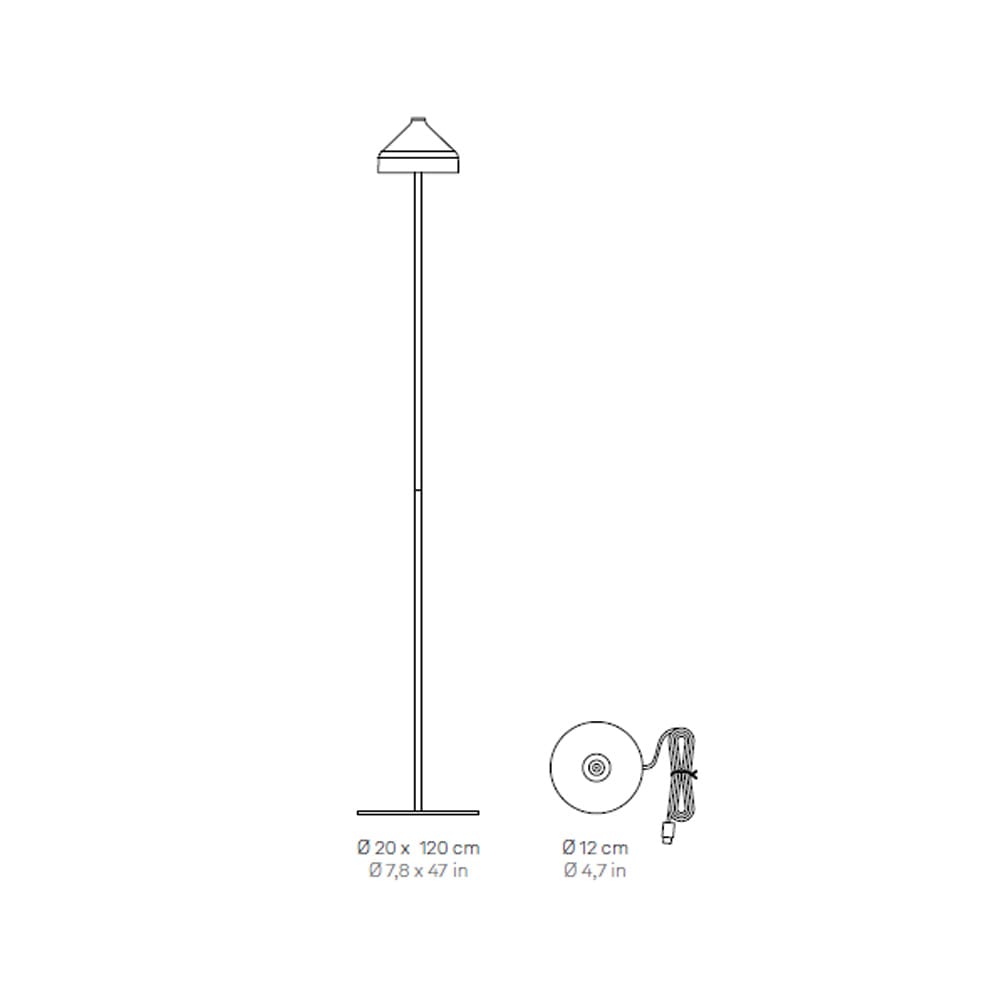 Amelie is a collection of battery-powered, portable and rechargeable lamps, designed by designer Sara Moroni and produced by the Zafferano AiLati brand. Available in table, floor, wall, suspended and with spike versions. A “touch” control present in the upper part of the head allows switching on, adjusting the light intensity and selecting the color temperature of the light between 2200 K, 2700 K and 3000 K. Thanks to a high protection index, the lamp can also be used outdoors. Furthermore, Amelie floor lamp is supplied with a hook and a silicone cap, which allow it to be transformed into a pendant lamp. The lamp is recharged by unscrewing the head and placing it on the contact charging base, included; charger included.