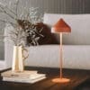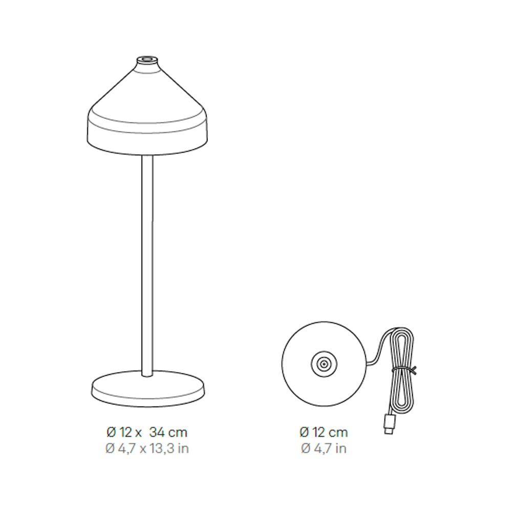 Amelie is a collection of battery-powered, portable and rechargeable lamps, designed by designer Sara Moroni and produced by the Zafferano AiLati brand. Available in table, floor, wall, suspended and with spike versions. A “touch” control present in the upper part of the head allows switching on, adjusting the light intensity and selecting the color temperature of the light between 2200 K, 2700 K and 3000 K. Thanks to a high protection index, the lamp can also be used outdoors. Furthermore, Amelie table lamp is supplied with a hook and a silicone cap, which allow it to be transformed into a pendant lamp. The lamp is recharged by unscrewing the head and placing it on the contact charging base, included; charger included.