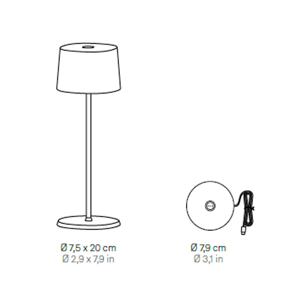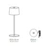 Light source: LED 2,2 W – 2200/2700/3000 K – 183/187/225 lumens – CRI>80 – 5 Vdc max. 1A – battery (Lasts approximately 9 hours at maximum power) – Dimmable – IP65. Dimensions: H 20 cm Ø 7,5 cm