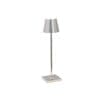 Rechargeable table lamp with contact charging base, with painted aluminum body, polycarbonate diffuser and LED light source.