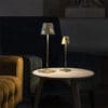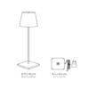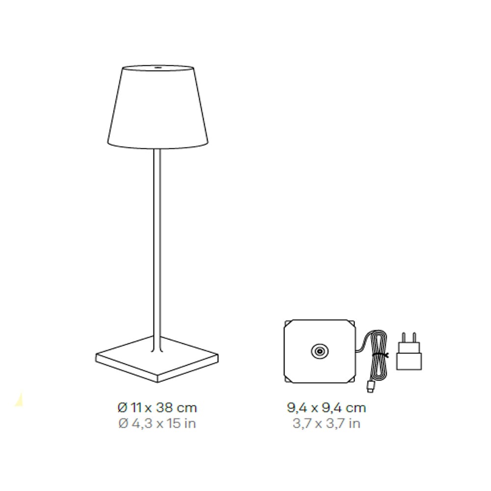 Poldina Pro Micro from the Zafferano brand is a rechargeable table lamp, including a contact charging base, with a painted aluminum body, polycarbonate diffuser and LED light source. It turns on, off and dims thanks to a touch button on the diffuser and is equipped with the light color temperature selection function (2200K-2700K-3000K). Lamps with a crackled gold leaf finish are not suitable for outdoor use. Due to the technique adopted in processing with metal leaf, the final appearance of the lamps may be different. Any discrepancies attest to the value and uniqueness of each lamp and should not be considered as imperfections. IP65 protection rating. Battery life is guaranteed for at least 7/8 hours.