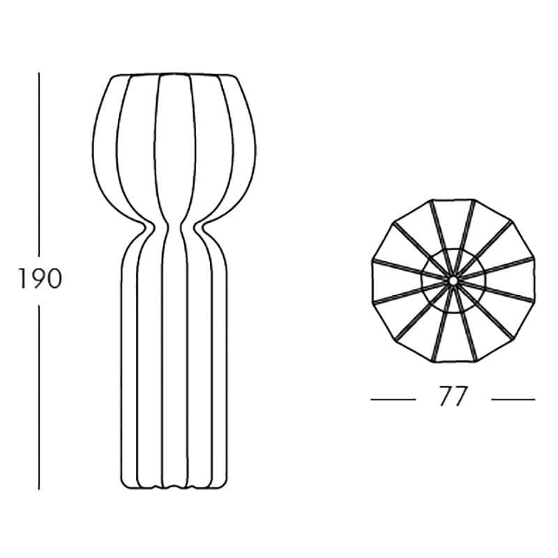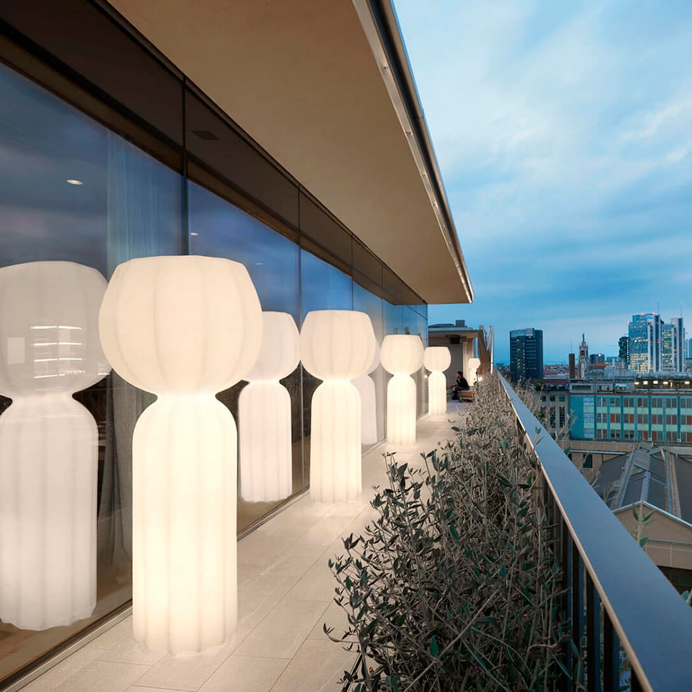 The anti-tipping base and the base for fixing to the ground for the Cucun lamp are recommended accessories for its outdoor use. Cucun is a large floor lamp inspired by the simple and natural shapes of flowers, vegetables and bulbs. The particular structure in rotational polyethylene recalls, in its surface texture and ribbing, a resin coating which recalls the themes of some icons of Italian design in the Sixties, creating soft luminous effects. Ideal for decorating gardens and outdoor spaces, it is also perfect for interiors, thanks to its strong decorative presence.