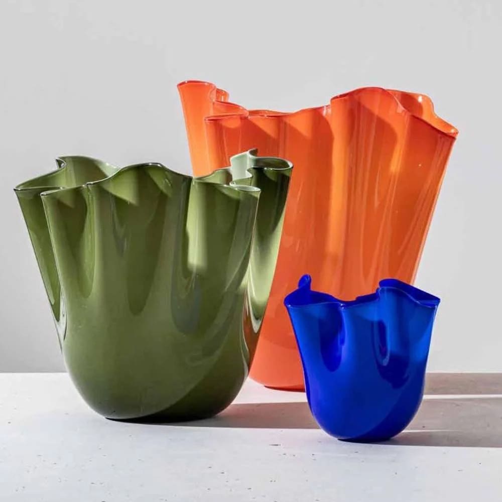 Fazzoletto by Venini is an iconic Murano glass vase, designed in 1948 by Fulvio Bianconi. It is named after its distinctive shape, which resembles a handkerchief floating in the wind, with wavy edges and fluid lines that make each piece unique. Handcrafted by master glassmakers using the blown glass technique, the Fazzoletto vase symbolizes the fusion of Venetian tradition and innovation in the world of design. Available in various color combinations, this masterpiece of craftsmanship perfectly blends art and functionality. Its elegant and sculptural shape makes it an ideal decorative object for refined interiors, adding a touch of class and originality.