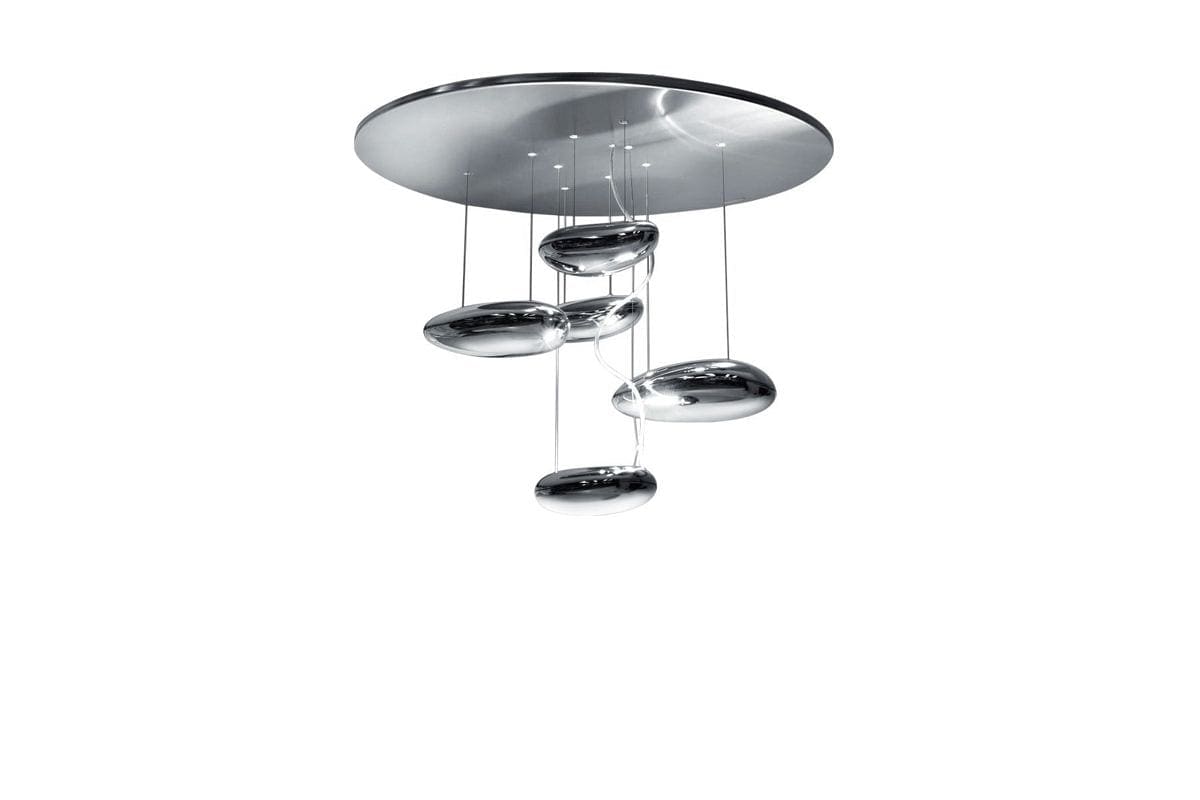 Range extension of Mercury series, in smaller dimension. “A ceiling fixture that places a floating assembly of large pebbles below a simple modern disc. These in turn reflect each other bouncing light between their taught bio – morphic surfaces and reflecting the environment around them. During the day the piece acts as a sculptural object reflecting the dynamics of natural light and the movement of people around them.” Materials: structure in brushed stainless steel and painted aluminum. Light fixtures in chromed aluminium. Hanging in chromed plastic.