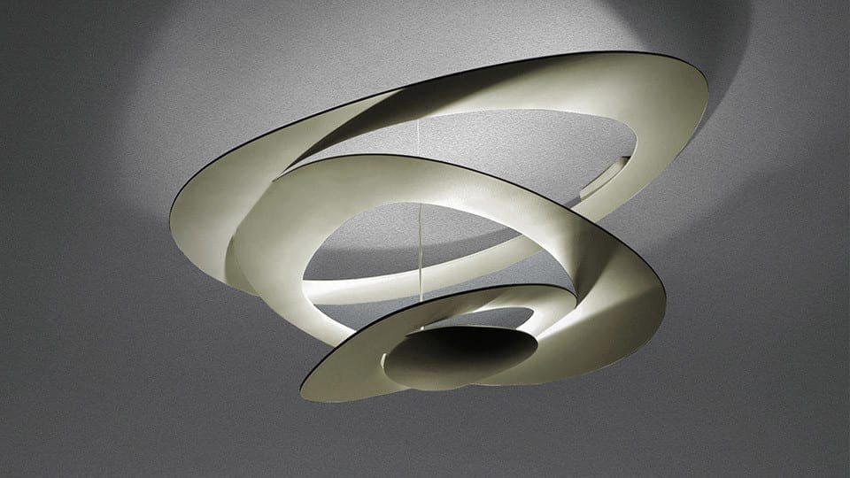 Suspension lamp in painted aluminium. Opening out of a slim disk are fluttering spirals, which fall gently downwards, creating magical effects of form and light.