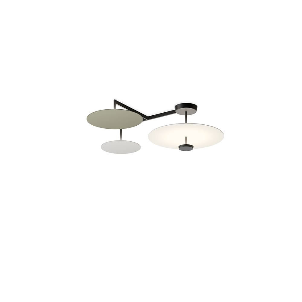 The collection of Flat LED ceiling lights, designed by Japanese designer Ichiro Iwasaki for the Vibia brand, is composed of horizontal metal discs positioned at different heights. Available in different colors. The light reflected from their surface radiates an enveloping and enveloping glow that seems to come from within. This ceiling lamp, both delicate and graphic, seems to float in space.