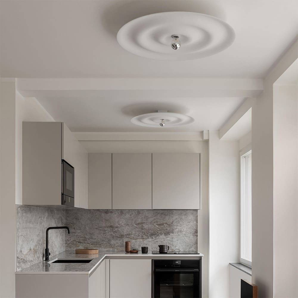 Alma W171 is a family of wall, ceiling and suspension lamps, designed by Tham & Videgård and produced by the Wästberg brand. Based on the graceful curve of a rotated sine wave, w171 Alma is understated yet charming with its sculptural appearance and soft contrasts between light and shadow. Behind the seemingly simple curves lies true craftsmanship, using artfully formed aluminum to capture smooth waves. The matte satin finish makes w171 Alma intriguing even during the day, with its concentric circles of shadow and light. With its slim proportions, w171 Alma takes up little visual space, making it an ideal lighting solution for areas with low ceilings.