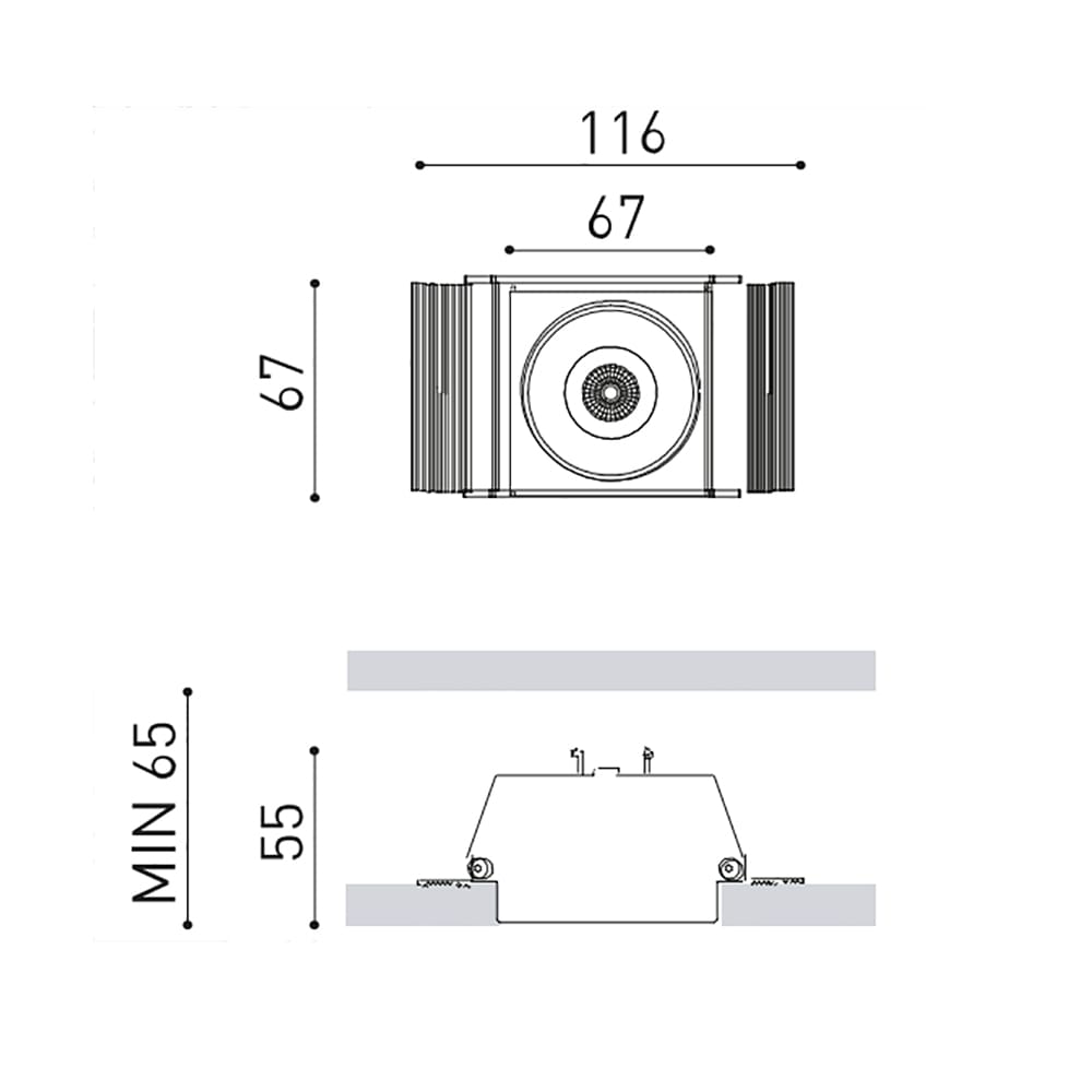 Light source: LED 6W – 2700K – 580 lumens – CRI>90 – 220-240V – driver included remote – dimmer DALI – IP20. Dimensions: L 116 mm W 55 mm H 67 mm