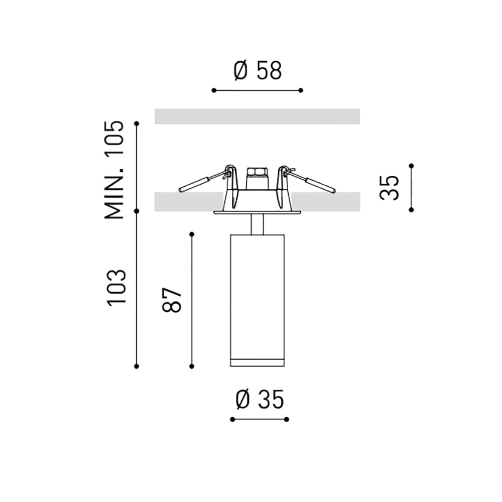 Light source: LED 5,5W – 3000K – 660 lumens – CRI>90 – 220-240V – driver included – IP20. Dimensions: Ø 35 mm H 103 mm