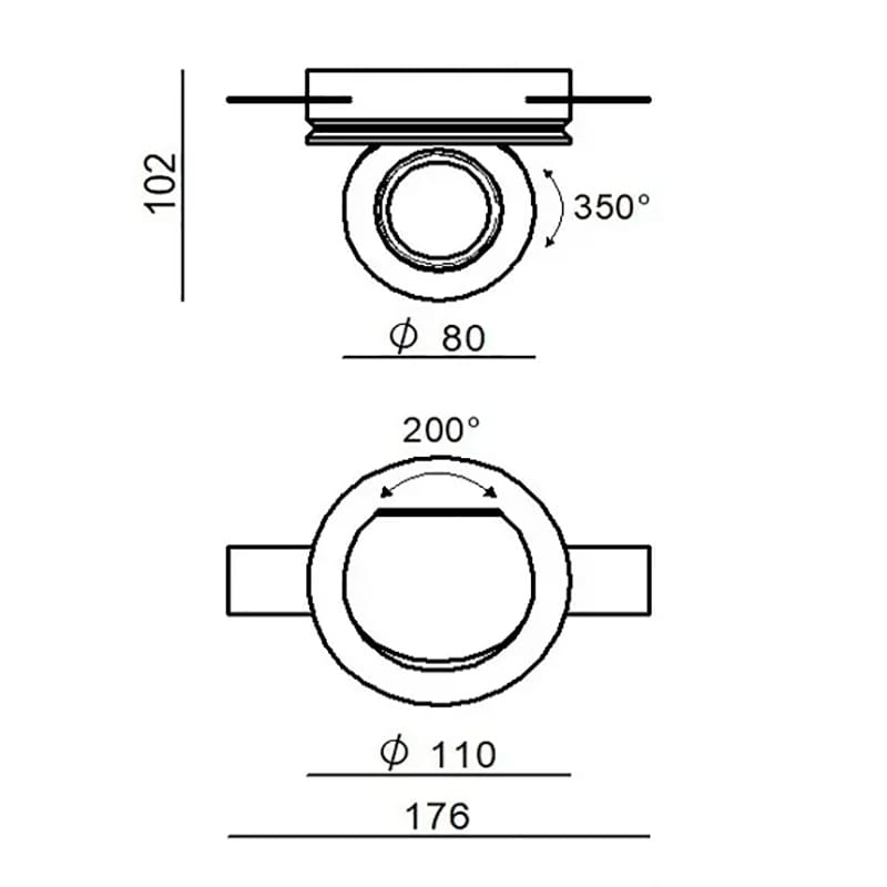 Light source: 1 arrayLED 9W – 995 lumens – 3000K – CRI=90 – 24V – IP20. Dimensions: L 176 mm H 102 mm Ø 110 mm