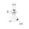 Light source: LED 6,1 W – 3000 K – 555 lumens – CRI ≥ 90 – 18 V 350 mA – IP20. Dimensions: H 117 mm Ø 26 mm
