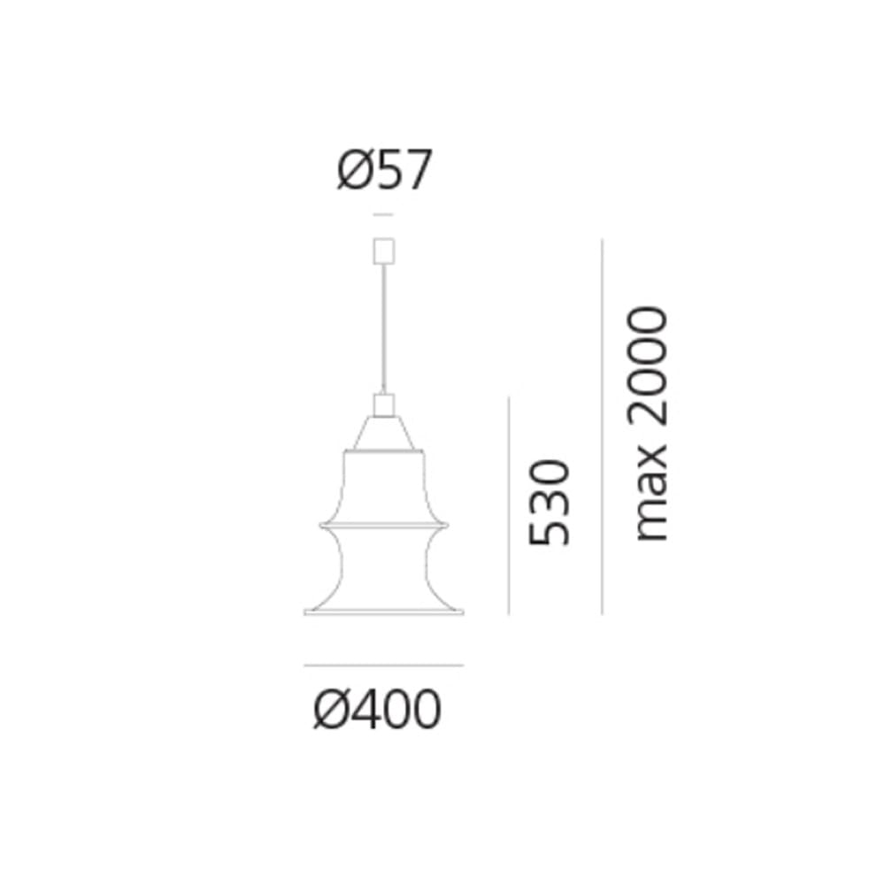Light source: 77W E27 (not Includesd) – IP20. Dimensions: H 530 mm H max. 2000 mm Ø base 400 mm. Includes: 1 x DS2040RIF ( rod + electrified body) 1 x DS2040DCRCI (fireproof fabric 53 e cerchi inox)