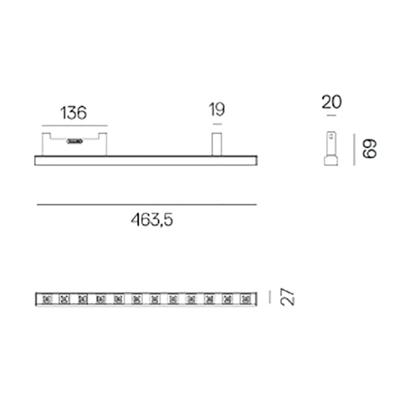 Light source: LED 25W 3000K – 2232 lumens – CRI90 – dimmable APP . Dimensions: L 463 mm W 27 mm H 69 mm