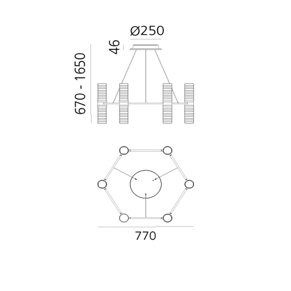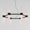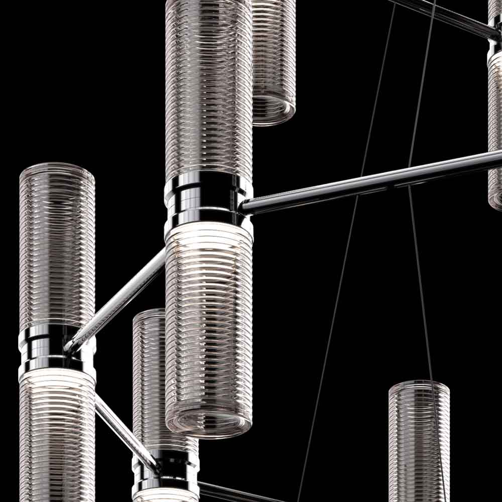 Zephyr is a minimalist and elegant chandelier, designed by Carlo Colombo and produced by the Artemide brand, with a modular structure that allows for infinite customised layouts according to the needs of each project. The modular element is a double cylindrical diffuser with a central body that encloses the light sources and, by means of two rings that rotate on the same axis, defines the position of the neighbouring lighting bodies by positioning the structural connecting elements. The diffuser is made of hand-blown clear glass in a mould with a wavy shape whose vertices are then ground to create a horizontal texture that alternates transparent and opaline diffusion strips.