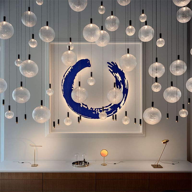 The Par 18 collection by Catellani & Smith is the result of a refined dialogue between design precision and artisanal craftsmanship. Each piece features mouth-blown glass spheres with an irregular inner texture, designed exclusively by the brand and crafted by Bohemian glass masters. The surface, playfully reminiscent of a golf ball, retains the transparency of the glass while producing a fascinating interaction between light and texture. The result is a vibrant, shifting luminosity that changes with the viewer’s perspective and the ambient light. Available in multiple configurations and diameters, Par 18 lends itself to elegant and dramatic installations, both in private interiors and contract environments.
