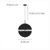 Light source: LED E27, 110V (bulb not supplied) o 240V, AC 3x8W, 2700k – lumens 2700 – CRI >80 – dimmable – Dimensions: Shades Ø 40 cm, Base Ø 9×3,5 cm, cuttable to size cable, H max, 200 cm / rod 63 cm