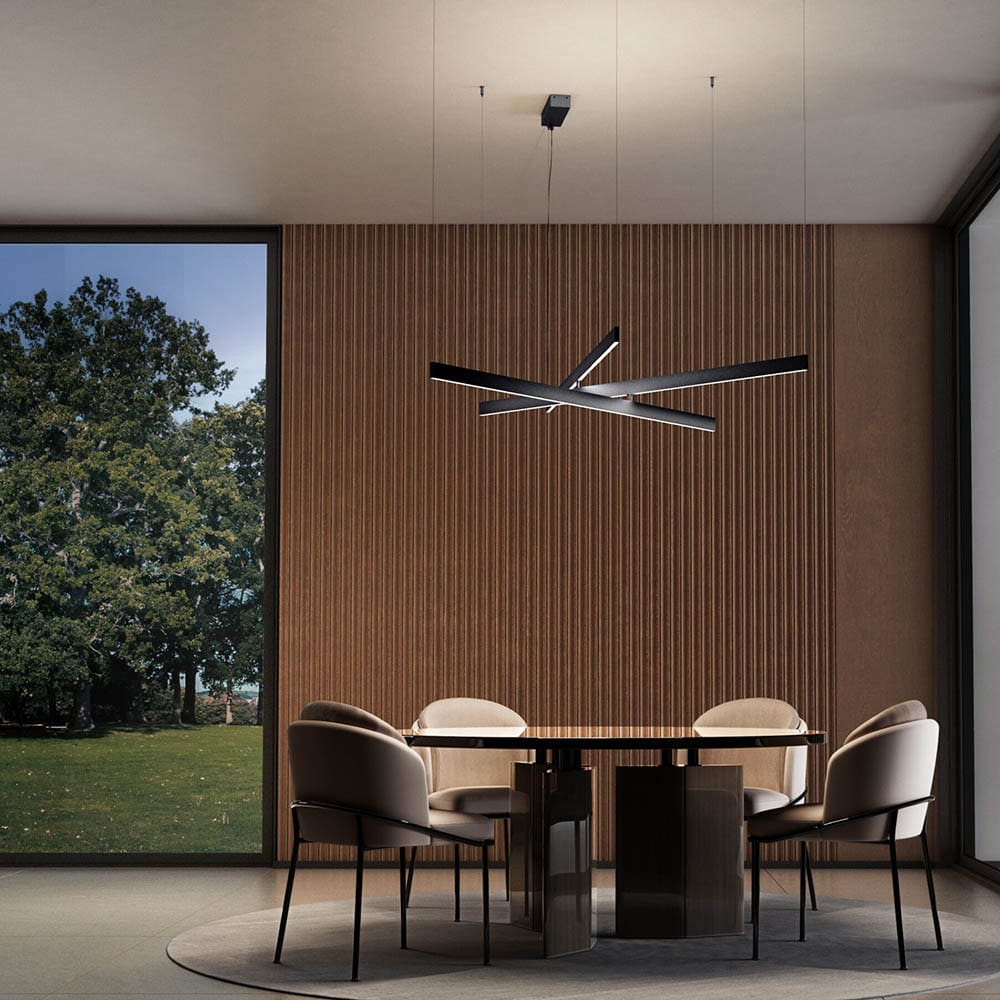 With a strong expressive force, its graphic sign becomes a sculpture that illuminates and delights. Fly, designed by Massimiliano Raggi, is a versatile lamp that can be used in different rooms of the home, or in commercial and hospitality settings. The Fly light bar is available in satin golden nickel, brushed nickel-bronze and anthracite finishes. The Fly Multiple suspension version allows you to orient and position the arms to create different compositions, and provides double light emission (above and below) for both direct and ambient light.