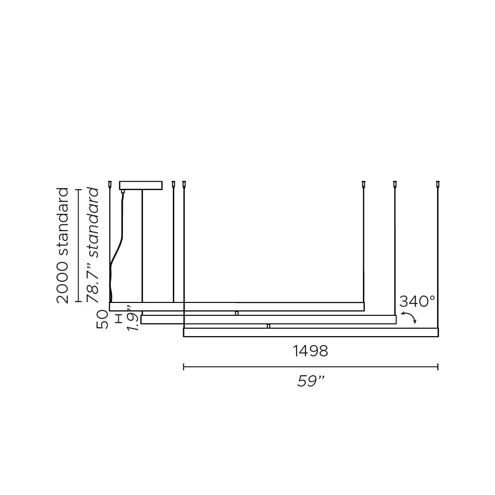 Light source: Superior: 3 x 20W Strip LED – 6740 lumens – Inferior: 3 x 20W Strip LED – 6740 lumens – 2700 K – CRI>90 – 220/240 V – Phase-cut dimmer/Triac – IP20. Dimensions: H 2250 mm L 1498 mm