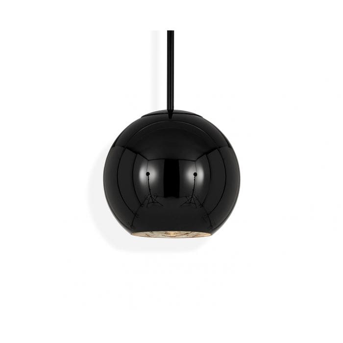 Created by Tom Dixon, Copper is a collection of steel lamps made of copper painted polycarbonate. In fetish black, Copper becomes a patented monochromatic sphere, a smooth black ball with a metallic aluminum interior. Designed in our German partner factories, this high gloss black lacquer has been appreciated on traditional Japanese lacquer furniture or in Bauhaus interiors. The copper pendants are transformed by the application of high gloss black with a bright silver interior to produce a better quality of light than ever before.