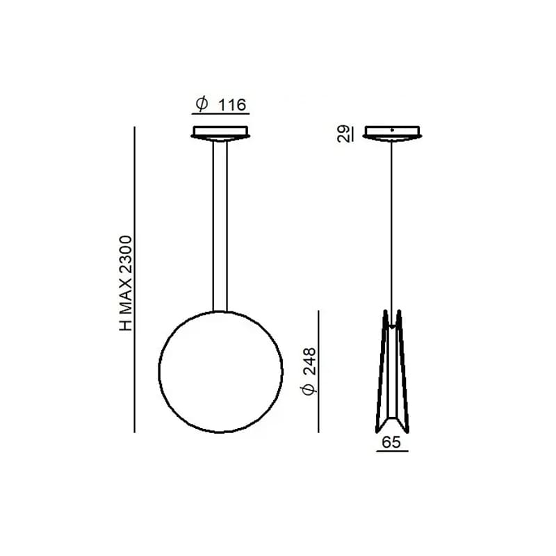 Light source: 96 topLED 16W – 1983 lumens – 3000 K – CRI=90 – 220-240 V – PHASE-CUT dim – IP20. Dimensions: H max. 2300 mm Ø 248 mm