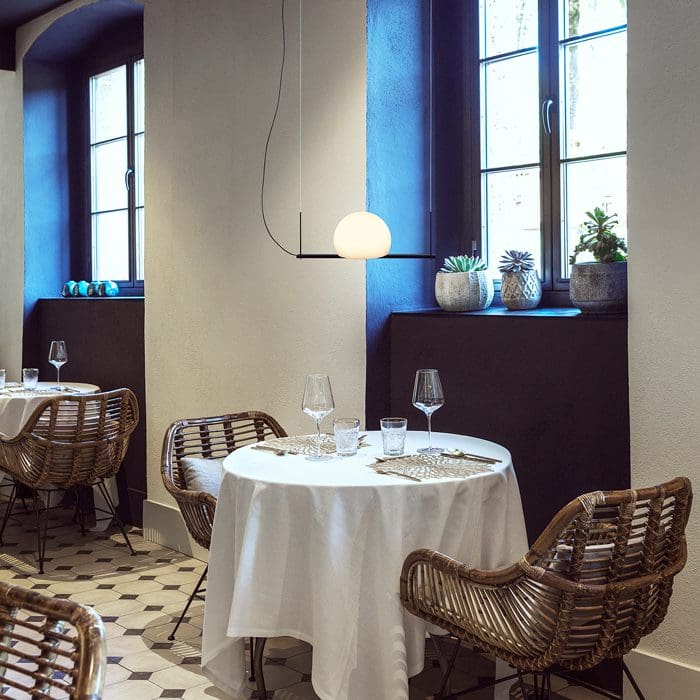 Circ is a unique collection of lamps, produced by the famous and elegant Estiluz brand. Available in different models and finishes. Design by Nahtrang Studio. Ideal for living room, garden, terrace, bedroom, restaurant and bar. Circ metal floor lamp provides direct and indirect light. The P3729 lamp is for indoor environments, made of translucent polyethylene and a metal bar behind that continues beyond the lampshade.